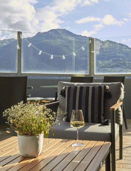 À l’extérieur, notre magnifique terrasse panoramique orientée sud-ouest vous permettra de profiter d’une vue splendide sur Nendaz, la plaine du Rhône et son vignoble et les Alpes bernoises tout en appréciant les rayons du soleil de Veysonnaz. Installez-vous confortablement sur la terrasse la plus ensoleillée de Veysonnaz pour des moments gastronomiques à deux ou entre amis inoubliables. Vivez des couchers de soleil mémorables.
